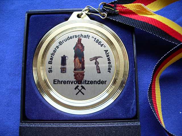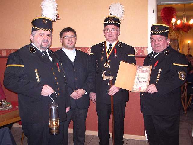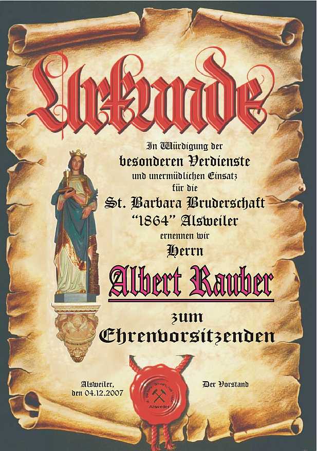 vorgenommen vom Präses der St. Barbarabruderschaft Alsweiler Herrn Pastor Wolfgang Breininger und dem neuen 1.Vorsitzenden Herrn Helmut Rauber. Albert Rauber erhält eine Ehrenurkunde und eine Ehrenmedaille.