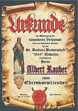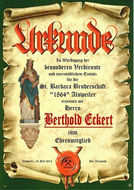 Am 04. 12. 2007 wurde Albert Rauber zum Ehrenvorsitzenden der St. Barbara Bruderschaft "1864" Alsweiler ernannt |